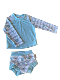 protect your little one in style with this charming two-piece rash guard swim set! Perfect for the beach, pool, or splash pad.